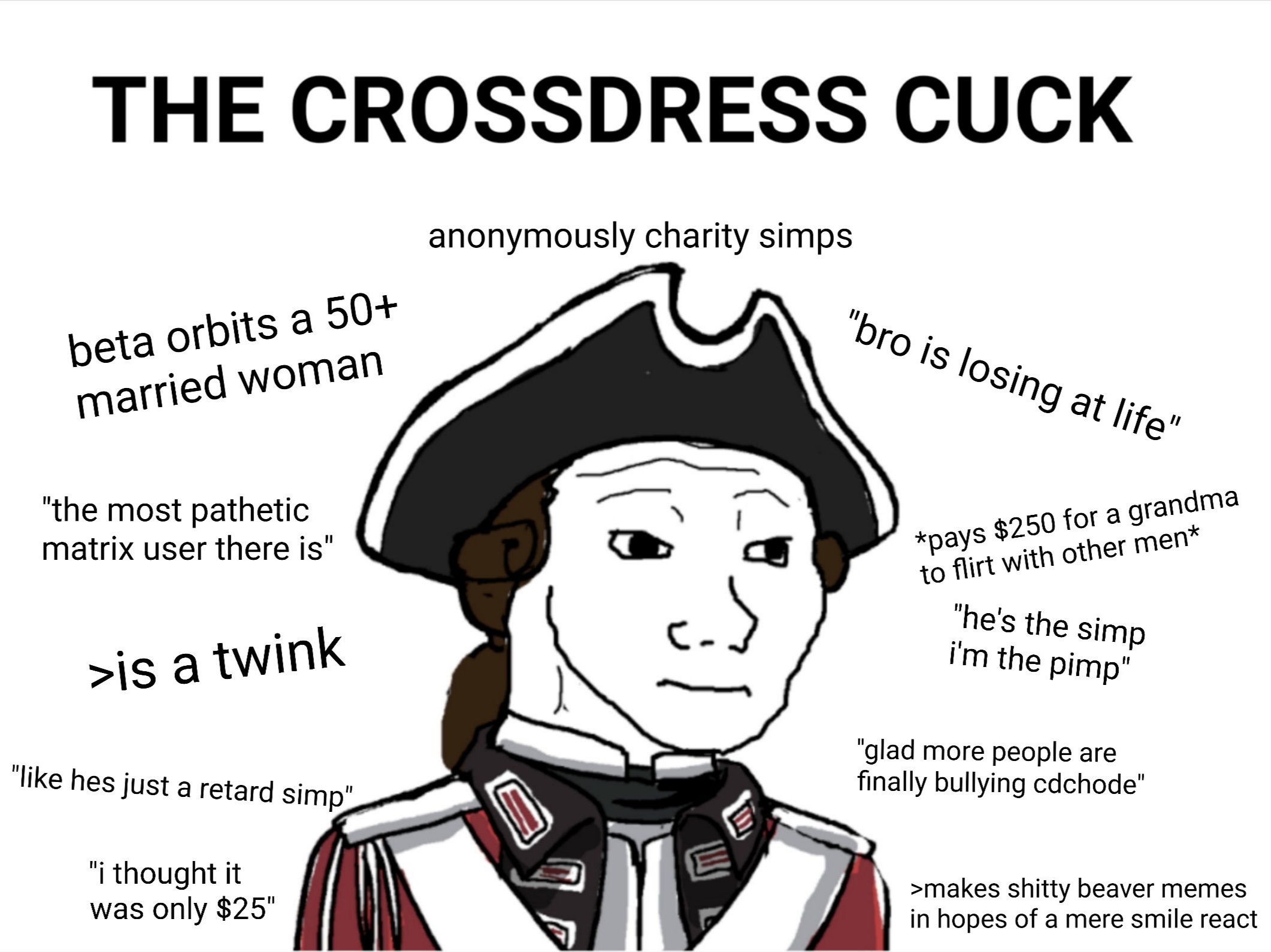 The lowest of the low, a simp for an e-girl, and not just any e-girl, an ugly drug addict married one in her 50s. He spends his days gleefully watching her blogposts in rdp, (real dick penis), one hand on his dick, the other on his keyboard. For the brief periods he puts two hands on the computer he spends the time making painfully unfunny memes in hopes m'lady will give him a crumb of attention and make his day.