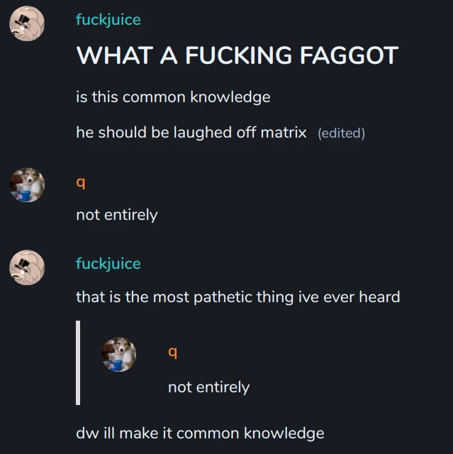 “the most pathetic matrix user. this guy is even worse than the twitch simps, at least they get their name read by the young cleavage girl, HE GETS NOTHING” -fuckjuice