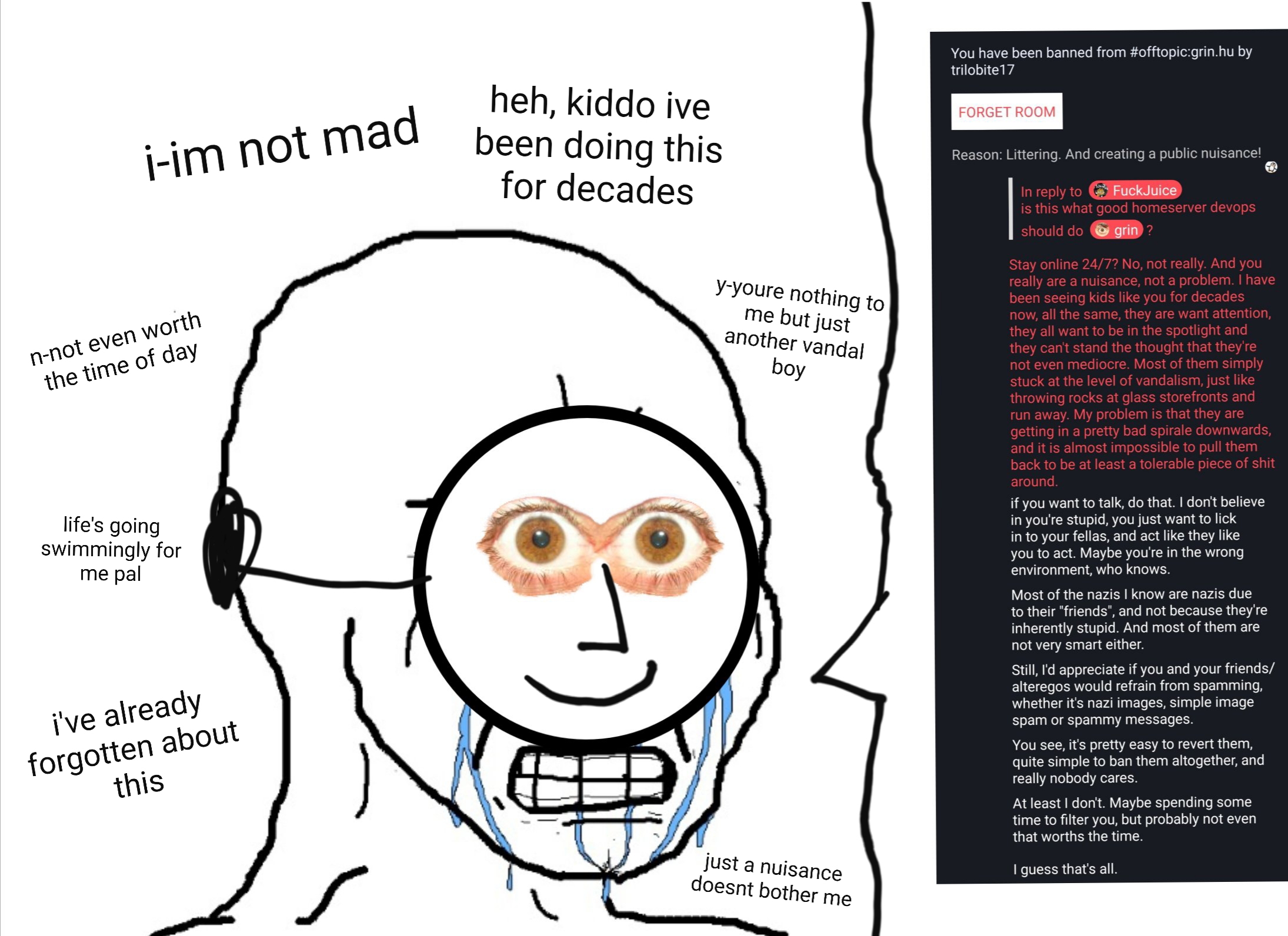 Insane man, broken English, believes being online for longer than you is something to respect BUCKO, tries doing that pseudo intellectual I've got you all figured out kid thing, "I've seen a million of you you're just another target boy", tells you he isn't then proceeds to write paragraphs expressing this belief, lonely hence why he keeps us around, wears a great many masks to hide his true feelings, definitely a tsundere deep down.