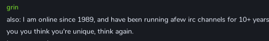 Insane man, broken English, believes being online for longer than you is something to respect BUCKO, tries doing that pseudo intellectual I've got you all figured out kid thing, "I've seen a million of you you're just another target boy", tells you he isn't then proceeds to write paragraphs expressing this belief, lonely hence why he keeps us around, wears a great many masks to hide his true feelings, definitely a tsundere deep down.