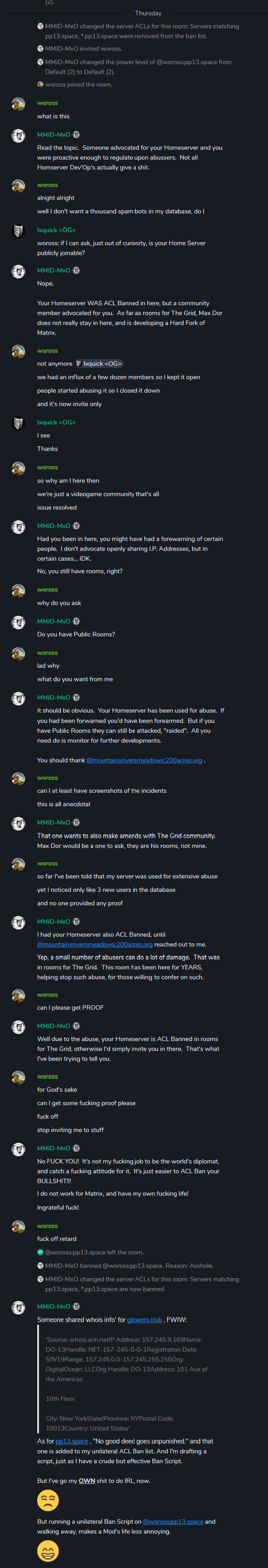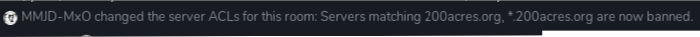 So this section will be rather short since avf handled the kooky kleaner is a superb fashion, by basically telling him to fuck off. Mmjd says a coordinated attack happened, avf tells him to simply ban the two guys, mmjd repeats “NO NO IT WAS A RAID”, avf informs him dealing with the 5 messages rubberbutter sent above is a waste of his time and then mmjd concludes avf condones raiding on his homeserver and later goes on to acl ban 200acres.Here is the full interaction just read it yourself and here is the acl ban.