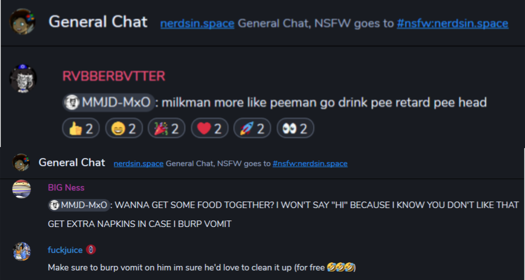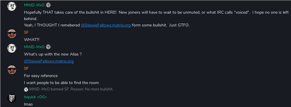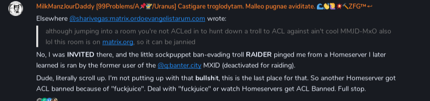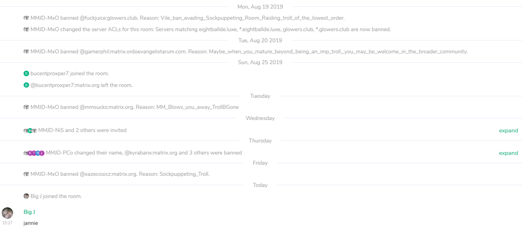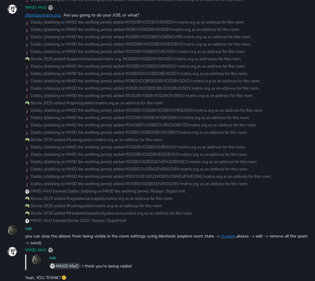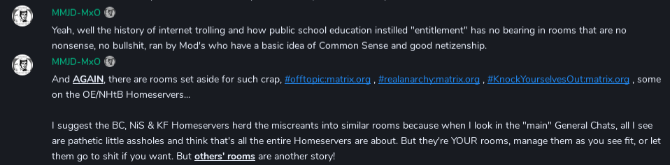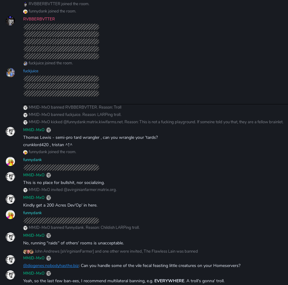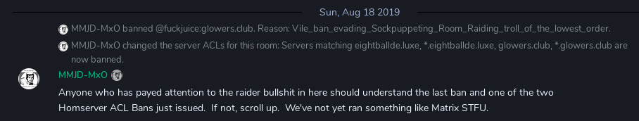 So as mentioned prior rubberbutter and I joined his regulators room(aka his cry baby diary room: Jannie's laments) said hello then proceeded to call him a jannie due to his removal of our greeting messages. No more than a dozen messages were sent yet mmjd believed this to be an organised raid and a direct attack on him. He proceeded to flip his shit and reeeee harder than I've ever seen anyone reeeee before. He banned The Flawless Gazelles with the reasoning being “Ten to one odds you brought the OTHER idiots in here”, it seems he is far better suited to getting down on his hands and knees and cleaning up our shit opposed to betting, because Flawless had nothing to do with our discovery of the King Kleaner. He started inviting and pinging the homeserver admins (including tristan when a nerdsin.space account wasn't even involved) and demanding multilateral banning for these “raiders” everywhere.