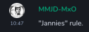 “mmjd more like mgtow minge jour djannie. um just ban them? I mean, idk, mmjd should take it easy. Just hang out with us in VC on game nights. Also he should learn how alt accounts work”~AVF