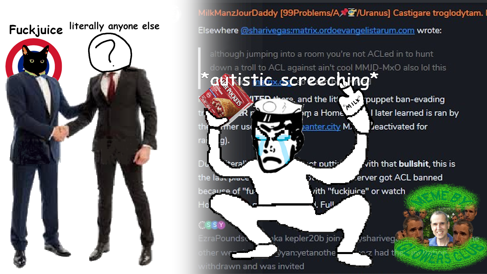 MilkManzJourDaddy (mmjd for short) aka MilkManzJourJannie has to be by far the most autistic user on all of matrix consequently he earns the title of the best lolcow. To begin he has a diary room that should be referred to as the “Jannie's Laments” in which he documents each and every action performed by that BIG ness fella, myself or anyone else who has dared to question his authority (of which he has none) he often writes copy pasta tier monologues on the most minute or mundane of our actions(such as joining or leaving a room). He is a confirmed pedophile and runs a room with #teensexuality:matrix.org reserved as an alias. The best way to get under the milk manz skin is to call him a janitor on the internet and remind him of his paycheck, to counter these barbarous attacks and to make sure he doesn't have an asthma attack whenever he leaves one of his 50 ☞ ؟⸮UNOFFICIAL⸮؟ echo chamber rooms, where he has total control and can SHUT IT DOWN at any moment he has proposed the "Jannies rule" in which anyone who dare speaketh the forbidden word shall be silenced via a ban. On the topic of bans he will ban anyone on sight who doesn't mention the rooms name or the size of his monster 4 inch dong every message or so for “off-topic” conversations. Even simply saying hi is far too much for his Jannie's Laments room, this is due to the fact he takes his “job” very seriously and has described his chat room as “no place for socialising”. This actually how I first came to the realisation that he is as mad as a hatter. Rubberbutter and I joined the room said hello then proceeded to call him a jannie due to his removal of our greeting messages. After about a dozen or so messages he did what he does best and banned us, (this is the only amount of power and control he will ever have in his pathetic life), then pinged our homeserver admins demanding account deactivations for this “raid”. This sort of behaviour only served to motivate the glowers and I to actually raid him and to actually fuck with him, for real, over and over, the more you poke the more he reacts a never ending supply of laughs. Put simply: nutty control freak jannie who does it for free is buttmad.