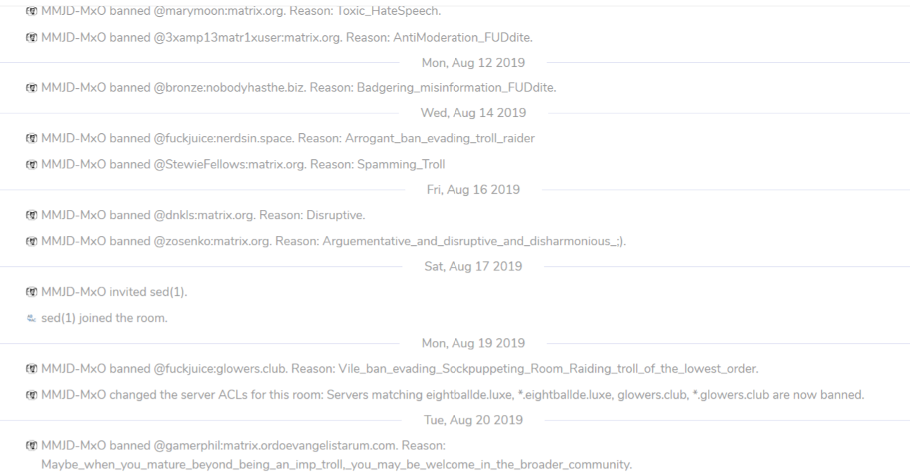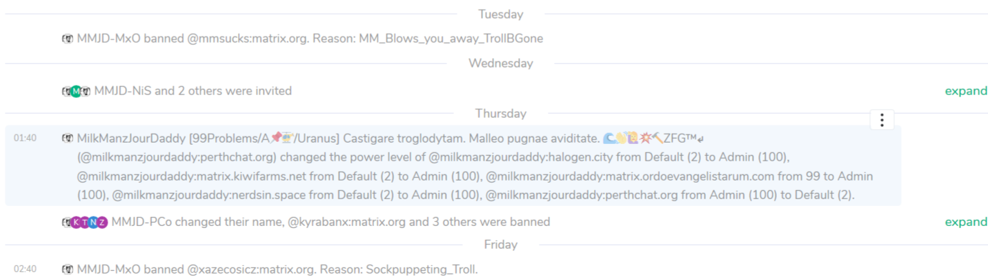 Here is a list of his known public rooms in case you're ever bored one day and feel like raiding, trolling or just throwing out a good old fashioned jannie (which I absolutely condone and encourage). I wouldn't expect much of a response from him in person other than a potentially humourous ban reason, due to the fact he uses his diary room to wail over such things but if I see one of his laments I'll be sure to post it here. I also wouldn't expect some sort of response from anyone else due to the fact his rooms are dead and mainly consist of him messing with there settings, inviting one of his 50,000 alt accounts, banning users that likely coughed in a manner he didn't approve of in a completely unrelated place or a bot posting links to videos. You'll also notice he has added "ZERO TOLERANCE FOR ANTI-MODERATION!!!" in quite a few of the descriptions for his rooms, so hopefully the RSS bot's and his stance on those damn jannie posters is crystal clear to the only sort of people joining his rooms… the jannie posters! That is of course because the only thing that would serve to motivate a man to join one of these rooms is his desire to milk the lolcow. Though strangely by some odd mix of self-deception and narcissism he believes them to be “the broader community”. Here we can see a recent pitiful attempt at enrollment and here we can see the activity before and of course finallyhere is the activity since, can't you just smell the desperation, it seems at some level in the recesses of his mind he realises believing his rooms to be of any significance is delusional. If any of these addresses are broken due to his removal out of fears of raiding try replacing the matrix.org with matrix.ordoevangelistarum.com or adding/removing the capital letters from words and if that still fails try hackerspaces.be or chat.weho.st then lastly if all else fails contact me and I'll try searching for a new and working one, if found I will update the page accordingly. The more fanciful addresses are due to our previous escapades.