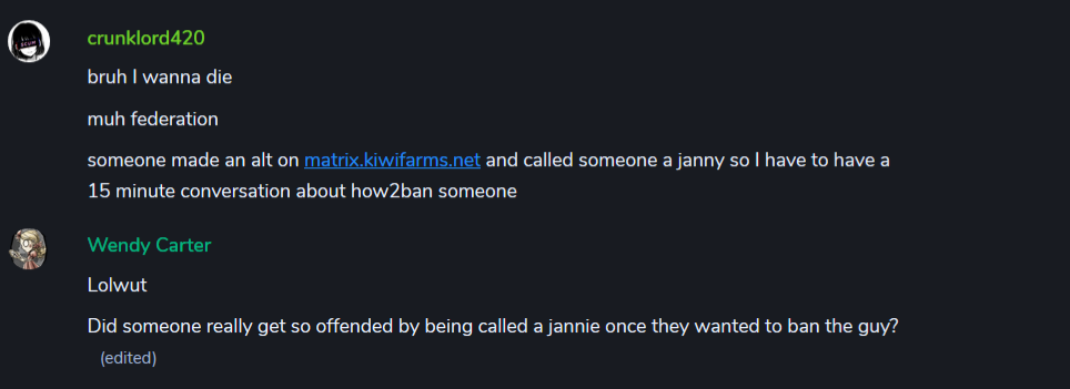 Once we saw his visceral, pained response to being called a jannie The glowers and I decided to follow our best instincts and hop around from room to room calling him… yes thats right a JANNIE. Here we can see me doing it in the halogen general discussion room, here I do it again in nerdsin.space and here's a team effort. When I was questioned as to why I was doing such a thing I explained how deranged he was, subsequently others not involved in the original event began to pile on. Since MilkManzJourJannie has zero power and influence in any room outside of his own and since the humiliation and torment was far too much for him to handle he decided to mute the rooms and burrow back into his safe space like a scared turtle. He decided to blame 200a for whatever reason despite the fact those dabbing on him were spread across various homeservers and it was primarily BIG ness and I after the initial ordeal wherein neither of us use a 200acres account. To counter our brutal onslaught he makes a proposition for the “jannie rule”. Here is the relevant screenshot. After this we decided to go three for three and head over to the kiwifarms general room, where we were met by good company, which only serves to reinforce this idea. SF also added the alias #braphog-central to the “Jannie's Laments” which seems rather fitting for a room dedicated to moderator circle jerks and loving the smell of your own flatulence, mmjd was not impressed.