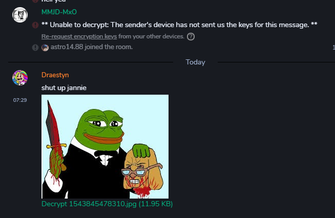 He runs an insane amount of “unofficial” rooms around matrix such as #F_Droid:matrix.org with there addresses reserved across each server. They are extremely inactive, with the activity of most looking something like this and autism central as a result of his presence alone. He actually joined the original encrypted glowers back when it was still used, but no one bothered paying much attention to him due to his seldom posting making most believe an exaggerated character was being played. You wouldn't believe someone genuinely communicated in such a ☞ ؟⸮way⸮؟outside the occasional shitpost now would you, but this lunatic truly does. He once got into a fight with Adolf Honkler (due to his stance on mgtow), then proceeded to make one of his usual copy pasta tier attacks on him in the staff lounge. Eventually their conflict was resolved via dms and mmjd pointed him to some users befitting of our rooms, which actually could have played a tiny part in the foundation of glowers.