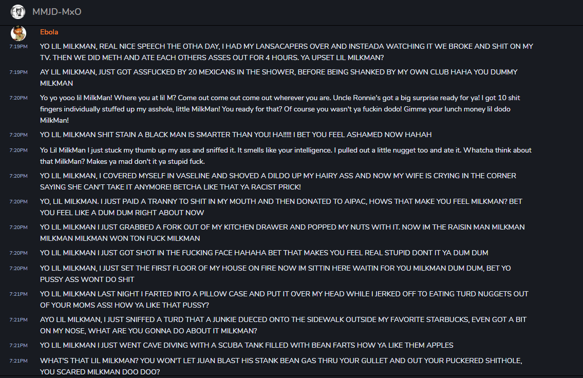 “just wanted you to know that you're an irrelevant jannie faggot who will never contribute anything worthwhile. You've been on Matrix for what, 4 years now? And you've still never even hosted your own server, nor done anything of value. You sit in your little diary room and moan about “bullies” while doing absolutely nothing about it other than banning them from a room they were never going to join any way. You should really just give up and leave. No one likes you. You never bring anyone any joy from being here, and I doubt you do so in real life either, so while you're at it, why not kill yourself?”~q